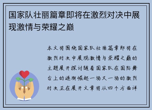 本文将围绕“国家队壮丽篇章即将在激烈对决中展现激情与荣耀之巅”的主题展开探讨。随着国家队在国际舞台上的逐渐崛起,一场又一场的激烈对决正在展开。文章将从四个方面详细阐述这段壮丽篇章:国家队的奋斗历程,球员的拼搏精神,教练团队的战略布局,以及球迷的支持与热情。每一个方面都展示了国家队如何在全球舞台上展现出无与伦比的激情与荣耀。这不仅是体育竞技的较量,更是国家荣誉的捍卫。通过这些维度的深入分析,我们将看到国家队如何一步步走向辉煌,成为国家骄傲。最终,文章将结合这些因素进行总结,强调体育精神和集体主义的伟大力量。 每支强大的国家队背后,都有一段不为人知的奋斗历程。从早期的起步阶段到如今在世界舞台上的崭露头角,国家队经历了无数的挑战与磨砺。无论是在亚洲杯的激烈角逐中,还是在世界杯的紧张赛场上,国家队始终在不断进步,力求超越自己。在每一次失败中汲取教训,在每一次胜利中汲取力量,国家队的历史充满了奋斗和拼搏的精神。 国家队的奋斗历程并不仅仅是球员的努力,也离不开背后无数工作人员的辛勤付出。从技术人员到医疗团队,从分析师到后勤保障,所有成员的共同协作为国家队提供了强大的支持。特别是在关键时刻,教练员的战术调整和临场指挥,常常成为胜负的分水岭。无论面对怎样的对手,国家队始终在为着荣誉和胜利不懈奋斗。 此外,国家队的奋斗历程还与国家的体育体系密不可分。越来越多的优秀年轻球员崭露头角,为国家队输送了源源不断的活力。这些球员不仅仅代表着个人的梦想,更承载着国家的期许。通过国家队的不断壮大,越来越多的年轻人看到希望,也让体育事业在国家中焕发出了新的生机。 国家队的胜利离不开每一位球员的拼搏精神。每一次比赛,无论是艰难的对抗还是突如其来的伤病,球员们总是以不屈不挠的精神迎接挑战。拼搏,不仅仅是为了个人的荣誉,更是为了整个国家的尊严与荣耀。国家队的球员们深知,他们肩负的责任不仅仅是赛场上的成绩,更是每一个观众的期望和祖国的荣光。 在比赛的激烈对抗中,球员们的精神面貌尤为重要。很多时候,比赛的胜负并不完全取决于技术和战术的执行,而是取决于球员们在困难时刻能够展现出的决心和毅力。无论是在比赛的最后时刻拼尽全力的冲刺,还是在伤病的困扰下坚持不懈的比赛,球员们展现出来的拼搏精神,正是国家队能够在激烈对决中屡屡战胜强敌的关键。 球员的拼搏精神也体现在他们的团队合作上。国家队的比赛不仅仅是个人的竞技,而是整个团队的协同作战。每一位球员都为着共同的目标而奋斗,相互支持,互相鼓励。正是这种无私的团队精神,成就了国家队的辉煌篇章。在国家队的比赛中,每一位球员都尽心尽力,为了共同的目标并肩作战,这种精神也激励着无数人。 国家队的胜利离不开教练团队的战略布局。在激烈的国际比赛中,教练员不仅需要对对手的战术进行精确的分析,还需要根据球队自身的特点制定相应的战术。在这种高压的环境下,教练员的决策至关重要。一个有效的战术安排能够使球队在复杂的局面中脱颖而出,甚至逆转不利局势。 教练团队的战略布局不仅体现在对比赛的战术安排上,还体现在球员的管理与激励上。在如此高强度的比赛中,保持球员的身体状态和心理状态至关重要。教练员需要时刻关注球员的身体健康,同时激发他们的斗志和信心。通过细致入微的调度与关怀,教练团队为球员创造了一个充满竞争力与团结氛围的环境。 除了常规的比赛战术,教练团队还要在一些关键比赛前进行心理战的部署。在大赛的舞台上,心理素质往往决定了比赛的成败。因此,教练团队通过各种方式增强球员的心理抗压能力,让球员能够在最关键的时刻冷静应对挑战。正是这些全面的战略布局,才使得国家队能够在众多强敌中脱颖而出,展现出无畏的斗志和出色的竞技水平。 国家队的辉煌离不开球迷的支持与热情。球迷是球队背后最坚强的力量,他们的每一次呐喊、每一声加油,都成为球员奋勇拼搏的动力。在国际赛事中,球迷的热情不仅仅局限于比赛场内,他们通过各种方式支持国家队,展现出对球队的无限热爱与忠诚。这种情感的传递,成为了球队凝聚力的重要来源。 球迷的支持不仅仅表现在赛事期间,在平时的训练和备战过程中,球迷的关注和期待同样给予了球员们巨大的动力。无论是通过社交媒体的互动,还是通过各种线下的活动,球迷们始终以积极的态度关注着国家队的每一场比赛,激励球员们不断超越自我。在这种支持的力量下,球员们往往能够在压力中保持冷静,在困难中找到突破。 与此同时,球迷的支持也促进了国家队体育文化的传播。随着国家队的成功,越来越多的年轻人投身于足球等体育项目,球迷文化逐渐成为社会的一部分。这种文化不仅仅是对比赛的热爱,也体现了人们对于集体主义和团队精神的认同。在球迷的陪伴下,国家队的壮丽篇章得以书写,球队与球迷之间形成了相互促进的良性循环。 总结: 从国家队的奋斗历程,到球员们的拼搏精神,再到教练团队的战略布局,以及球迷的支持与热情,种种因素共同交织成了国家队壮丽篇章的篇章。每一场比赛背后都充满了不懈的努力与坚持,每一次胜利都凝聚了无数人的汗水与泪水。国家队的每一步成长,都是